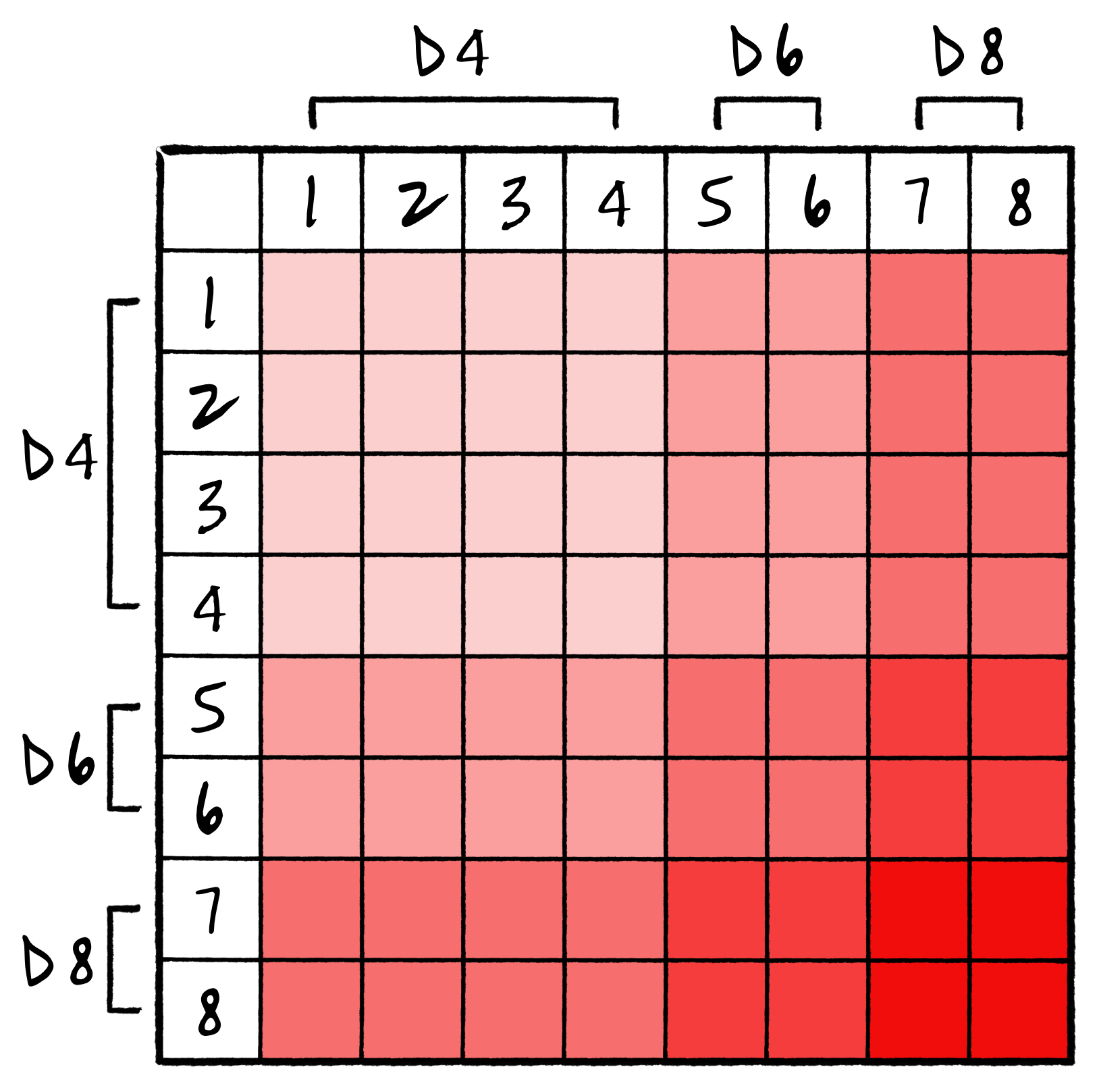 The diagram above is a ‘heat map’. The entries in the lightest shade, under d4 on both axes are the least severe events. Entries in the darkest shaded area under d8 on both axes are the most severe events.