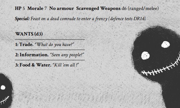 It has a d3 reaction table, specific to the creature. In this case, it has a set of three things the creatures might want. It provides something less ambiguous than ‘Friendly’, whilst giving some flavour to the creature too.