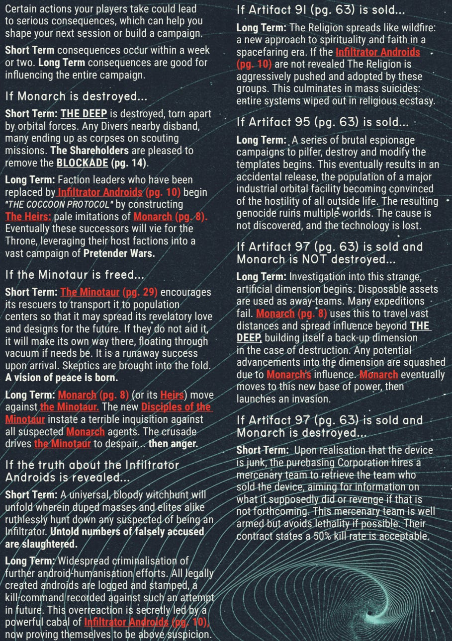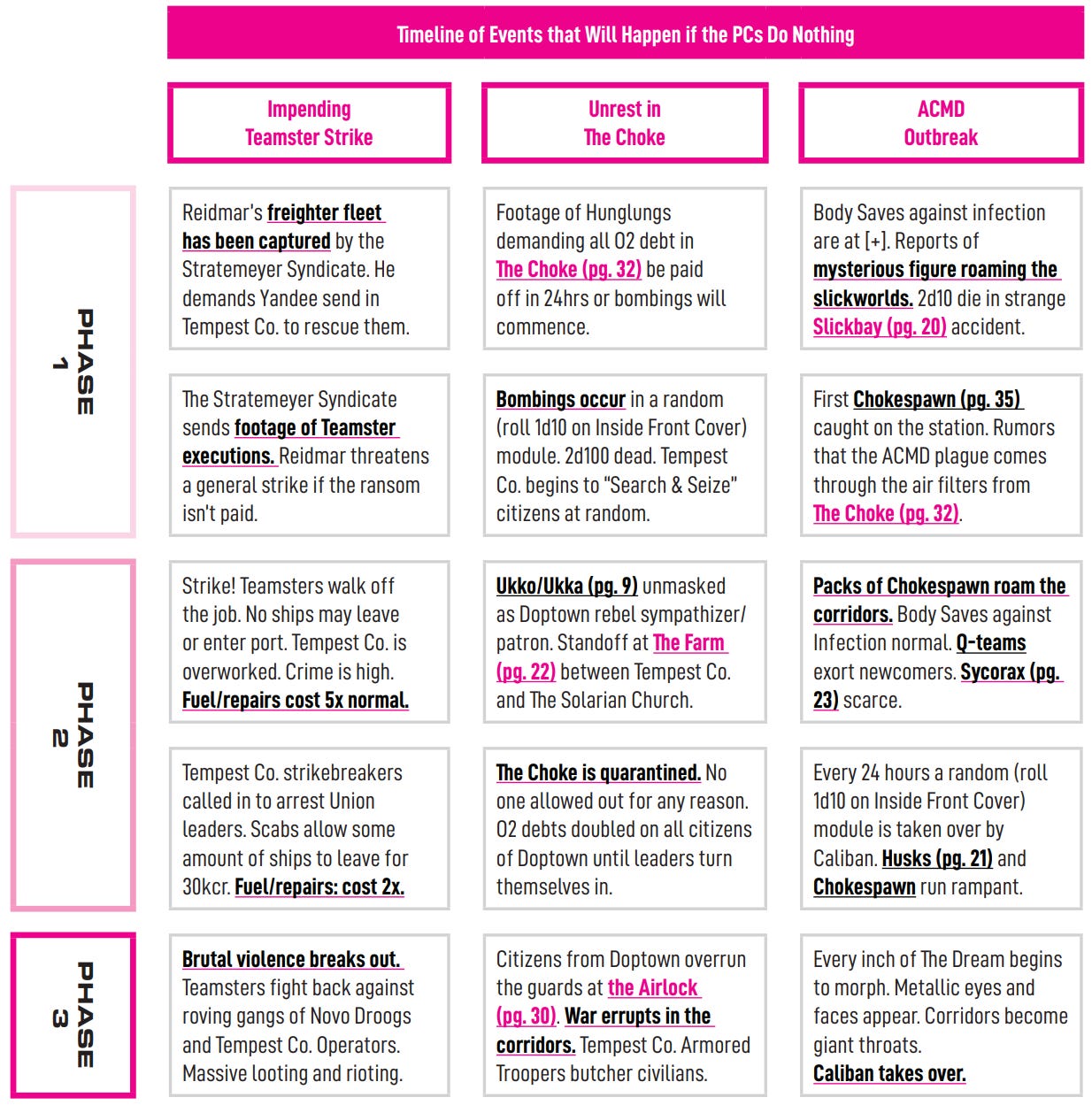 This is a snapshot in time, the starting conditions of the scenario. Sometimes, when we run our own games or modules, the starting situation is the only thing we write. To have the scenario evolve, we need some machinery.