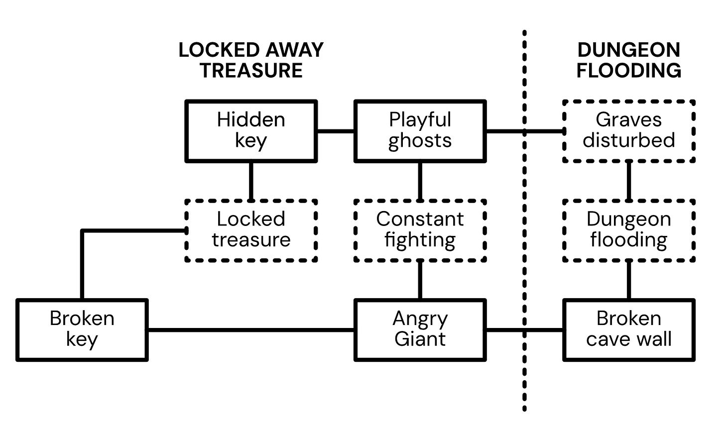 One of the best things we can do to make a scenario feel alive, is to evolve it. In our article on hyperclusters, we looked at mapping scenarios using diagrams. We used this example of a dungeon: