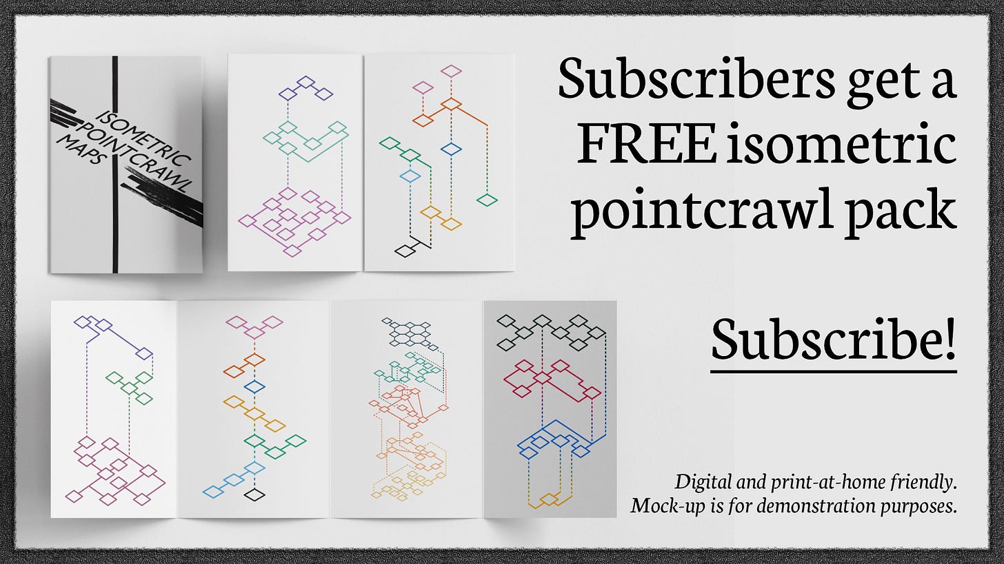 With a concrete illustration, you have to decide things like corridor lengths, room sizes, maybe even a consistent level of detail in the rooms. You also can’t change these on the fly so easily. With a pointcrawl, you can reshape the space with little work. ~Which is great if you are adaptive and improvisational like me~
